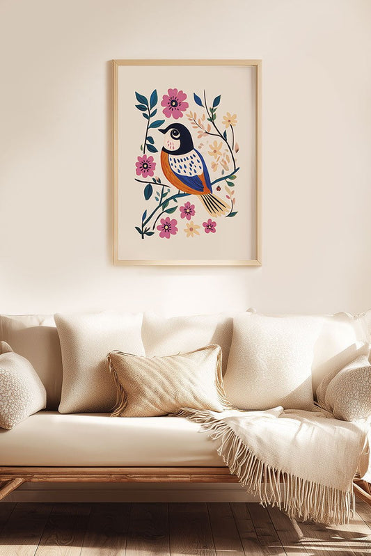 Mésange aux fleurs roses - Affiche Folk Art
